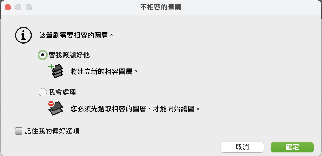 雖然許多筆刷都與特殊圖層相容,但有時候選用的筆刷仍可能會產生與您預期不同的筆刷痕跡。此外,也有一些筆刷不建議用於目前圖層。在這些情況下,Painter 會提示您,讓您選擇如何繼續。我們重新設計了這些對話方塊,以呈現清楚簡明的選項,讓您快速選擇後返回,專心於您的畫作。相關詳細資訊,請參閱特殊圖層偏好設定.