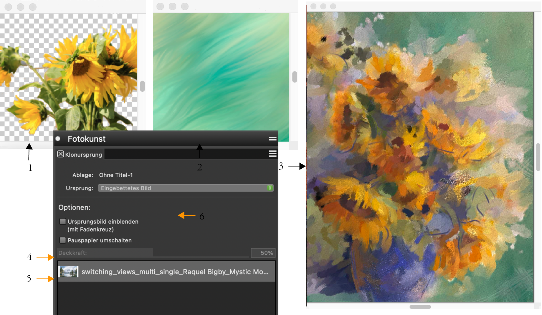 Die Sonnenblumen- (1) und Hintergrundbilder (2) wurden als Klonursprünge in das Klondokument eingebettet (3). Beide eingebetteten Klonursprünge (4 und 5) werden im Bedienfeld Klonursprung (6) angezeigt. Bilder und künstlerische Darstellung von Karen Bonaker.