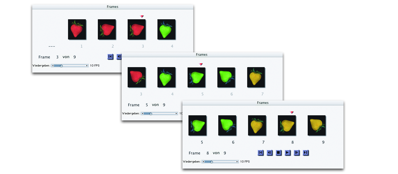 Sie müssen die Bildelemente für Priorität 2 in Sätzen zusammenfassen. Im folgenden Beispiel besteht die Sequenz der Priorität 2 für den neuen Strahl in der Änderung der Farbe. Der Film ist in drei Farbsätze geordnet. Der rote Farbbereich besteht aus den Frames 1 bis 3; der grüne Farbbereich besteht aus den Frames 4 bis 6; der gelbe Farbbereich besteht aus den Frames 7 bis 9. Die einzelnen Farbbereiche (Sätze) entsprechen der Sequenz in Priorität 1 (Änderung des Winkels) für den neuen Strahl und enthalten Bilder mit derselben Farbe, die jedoch in einem anderen Winkel platziert werden.