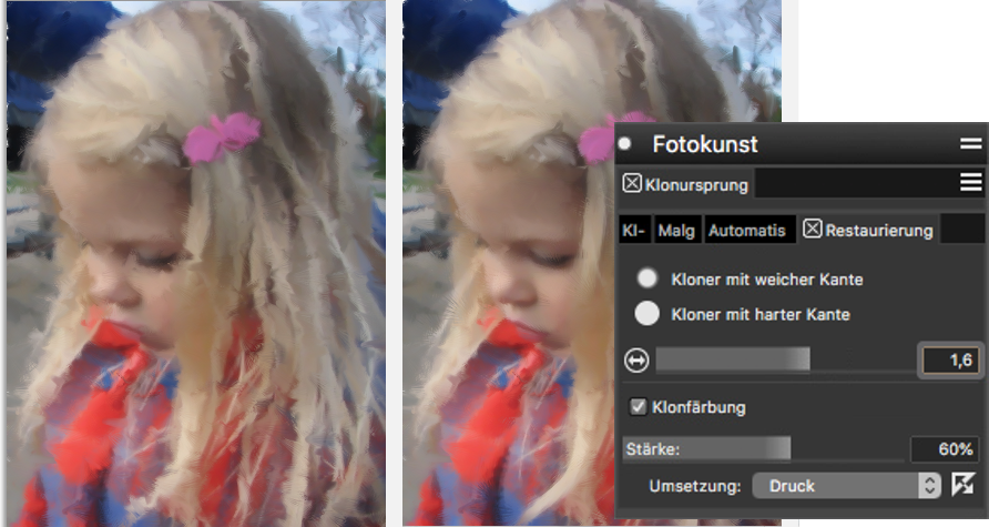 Nach Abschluss des automatischen Malvorgangs können Sie mithilfe des Bedienfelds Restaurierung einzelne Details des Originalfotos wiederherstellen. Das Bedienfeld Restaurierung eignet sich beispielsweise ausgezeichnet für die Wiederherstellung von Details in der Augenpartie von Personen.