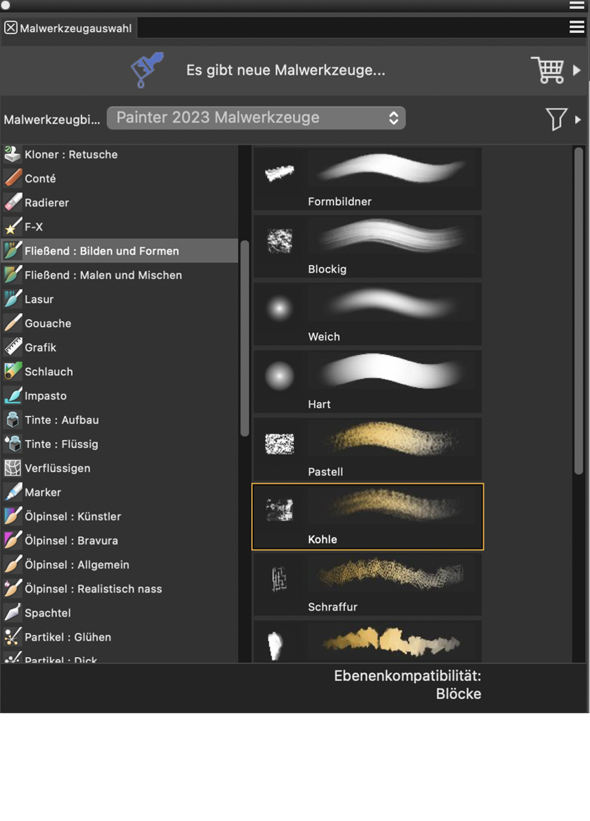 Weitere Informationen zu den in den Painter-Malwerkzeugbibliotheken enthaltenen Malwerkzeugkategorien sowie Muster der Malstriche finden Sie unter Referenz: Painter 2021-Malwerkzeugbibliothek.