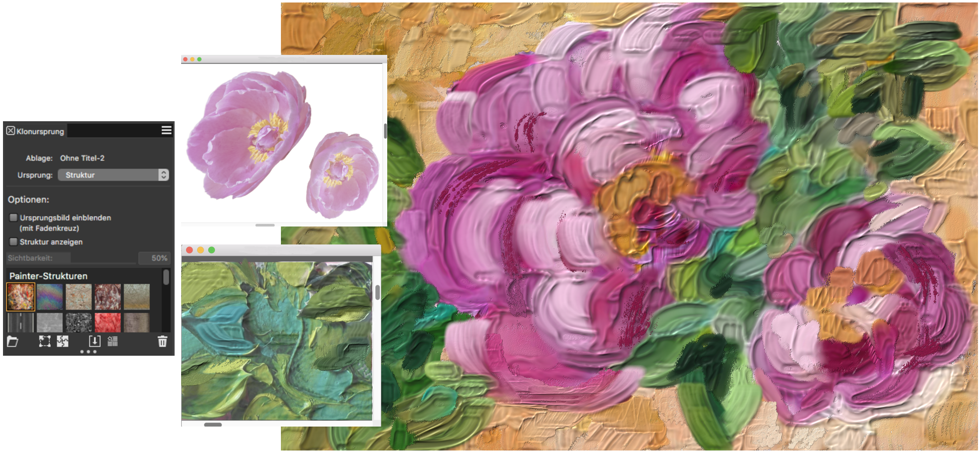 Erstellen Sie eigene Elemente, importieren Sie diese in die Strukturbibliothek und verwenden Sie sie als Klonursprung in Ihren Gemälden oder Fotocollagen.