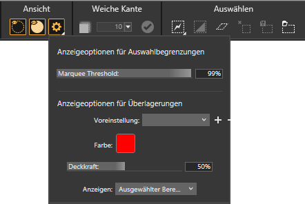 Auswahlbereiche lassen sich mit einem „klassischen" Markierungsrahmen, mit einer Überlagerung oder mit beidem visualisieren. Über das neue Flyout Auswahl-Anzeigeoptionen in der Eigenschaftsleiste kann schnell auf diese Einstellungen zugegriffen werden. Painter 2023 bietet zwei Farbüberlagerungsvoreinstellungen. Es können aber auch eigene Voreinstellungen jeder beliebigen Farbe angelegt werden. Wenn ein Kunstwerk Rottöne enthält, ist es praktisch, eine Überlagerungsfarbe zu verwenden, die die Auswahlbereiche leichter erkennen lässt. Mit dem neuen Steuerelement Markierungsrahmen-Schwellenwert können Sie die Pixeltransparenzstufe in einem Auswahlbereich anpassen, um exakt zu bestimmen, welche Bereiche mit geringerer Deckkraft in eine Auswahl aufgenommen werden sollen.