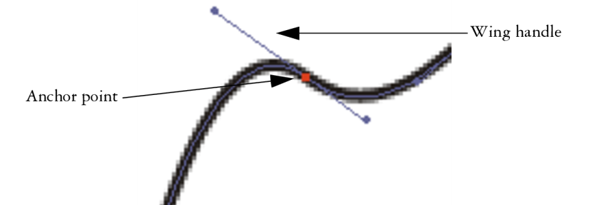 Bézier Lines can be straight or curved, and they consist of anchor points connected by line segments (or paths). When the path is a curve, "wings" extend from the anchor points. The wings are represented by a straight line and are tangent to the curve. The wings have control "handles" on them. By dragging the wing handle, you can change the curvature of the line segment.