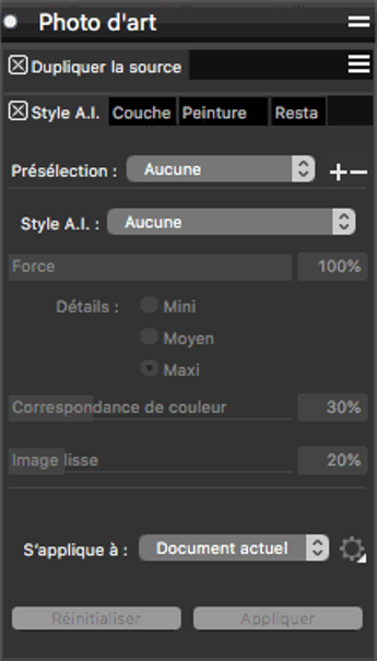 Les panneaux Photo d’art (Style A.I., Couche de fond, Peinture automatique et Restauration) sont regroupés. Les panneaux Style A.I. et Couche de fond vous permettent de préparer une photo pour peindre et dupliquer la photo. Vous pouvez ensuite accéder rapidement au panneau Peinture automatique pour créer la peinture (Étape 3). Enfin, vous pouvez accéder au panneau Restauration pour peaufiner votre peinture (Étape 4).