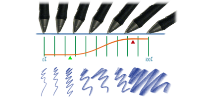 [移行範囲] スライダでは、スタイラスを傾けたときに極細ペンから幅の広いストロークに移行する角度を指定できます。このコントロールにより、鉛筆やマーカーなど、実際の画材の筆致をシミュレートできます。この現実的な例は、先の細い鉛筆を用紙に対して垂直に持っている状態です。用紙に対して 90 度で描画すると、非常に細い、またははっきりした線が描かれます。鉛筆を 60 度に傾けると、幅の広い、ソフトな線が描かれます。