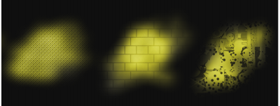 グロウ ブラシと描点ステンシルの組み合わせがうまく作用し、面白いテクスチャ効果と照明効果が作り出されています。左から右へ:用紙、テクスチャ、フロー マップは描点ステンシルのソースとして使用されます。