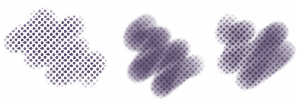 左から右へ:ジッターを適用していない描点ステンシル ブラシストローク、ジッターを適用した描点ステンシル ブラシストローク、ジッターと滑らかさを適用した描点ステンシル ブラシストローク。