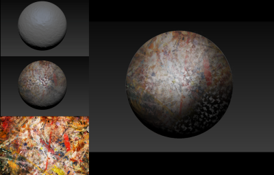 テクスチャ ブラシと描点ステンシル ブラシを、表示されているテクスチャやその他の用紙テクスチャと組み合わせて球面を作成しています (右)。