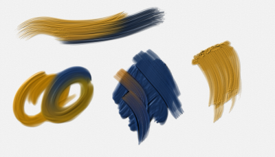 同じブラシだが、異なるテクニック プリセットが適用されたブラシストローク:ヘビー ボディ、ソフト ボディ、ドライ ブラシ。