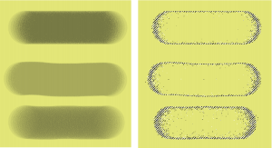 次の手法を使う選択ブラシで作成されたブラシストローク (左) とそれによる選択範囲 (右):[選択範囲に追加] 手法 (上)、[選択範囲への追加 (グレーズ)] (中央)、[選択範囲への追加 (アルファ ブレンド)] (下)。不透明度は 55%、間隔は 14%、粗さは 100% に設定されています