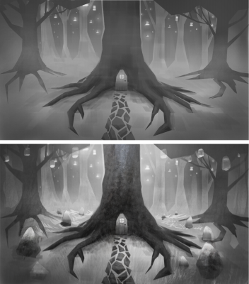 グレースケールのイラストレーション (上)、テクスチャが木にブレンドされています (下)。Justin Buus 氏によるアートワーク。