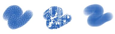由左至右:無抖動、有抖動,與有抖動及平滑的筆尖透版筆刷筆觸。