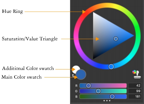 On the upper right corner of your screen you’ll see the large, beautiful Color panel, which lets you choose colors. You can choose colors by using the Hue Ring and the Saturation/Value Triangle. However, if you prefer to mix color by using numbers, you can adjust the three sliders that are located under the Hue Ring. By clicking the panel options button on the right side of the Color panel, you can set the sliders to display either Red, Green, and Blue, or Hue, Saturation, and Value.