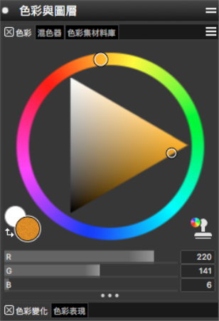 色彩滾輪中的手形工具經過重新設計,讓使用者在色相環及彩度/值三角形中更易查看和設定色彩。新的手形工具也涵蓋在暫時色彩選取器中,還可以釘選以便快速使用。相關詳細資訊,請參閱使用色彩選取器.
