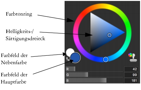 . Die Farbfelder in Corel Painter funktionieren anders als die Quadrate für die Vordergrundfarbe und die Hintergrundfarbe in Photoshop. Um die Farbe zu ändern, können Sie auf das Farbfeld Hauptfarbe oder Nebenfarbe doppelklicken und dann im Farbtonring eine neue Farbe auswählen. Sie können auch auf das Helligkeits-/Sättigungsdreieck klicken und eine neue Tönung oder Schattierung wählen. Sie können Nebenfarben zum Erstellen von Verläufen oder zur Verwendung von Malwerkzeugen mit mehr als einer Farbe nutzen. Im Unterschied zur Hintergrundfarbe in Photoshop verändert die Nebenfarbe die Arbeitsfläche nicht.