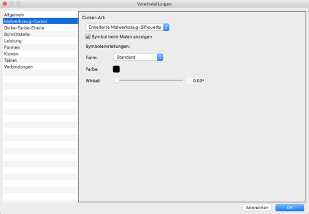 Die erweiterte Malwerkzeug-Silhouette zeigt nur eine Abbildung der Malwerkzeugvariante an, solange das Malwerkzeug ausgewählt ist und nicht gemalt wird. Sobald Sie mit dem Medienauftrag beginnen, ändert sich die erweiterte Malwerkzeug-Silhouette zu einem Symbol. Dies ermöglicht ein schnelleres und verzögerungsfreies Gestaltungserlebnis, da die Striche immer direkt unter dem Eingabestift aufgetragen werden. Weitere Informationen zu den Malwerkzeug-Einstellungen finden Sie unter Malwerkzeug-Cursor-Einstellungen.