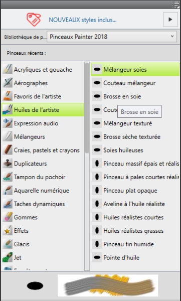 Corel Painter accélère et facilite l’accès à l’un des éléments qui font de Painter le chef de file de la peinture numérique : notre choix incomparable de pinceaux. À cette fin, vous pouvez désormais afficher le Sélecteur de styles sous forme de panneau. Les variantes de style récemment utilisées sont ainsi à portée de main, la Bibliothèque de styles aussitôt accessible en intégralité et vous pouvez placer la barre à l’endroit qui vous convient. Le Sélecteur de styles permet par ailleurs d’accéder directement aux packs de pinceaux les plus récents. Pour plus d’informations, voir la rubrique Affichage et personnalisation du Sélecteur de styles.