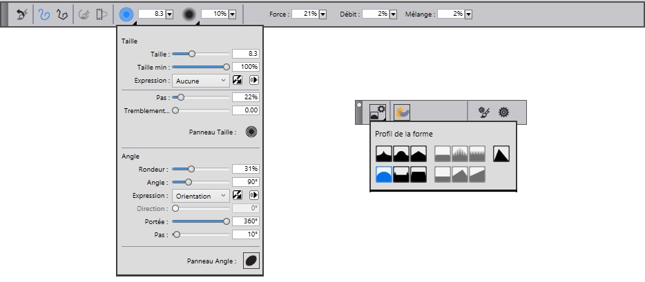 S’il est important d’optimiser les paramètres des outils et des styles, le temps passé à ajuster ces options n’est pas consacré à la peinture. Pour cette raison, les barres de propriétés ont été améliorées et simplifient le réglage des pinceaux. Par exemple, lorsque l’outil Styles est actif, la barre de propriétés étendue permet d’accéder rapidement aux divers panneaux associés, sans passer par les différents menus. Cette barre vous permet également de choisir de nouveaux profils de forme à la volée, de sélectionner une matière (par exemple du papier) et d’afficher les informations relatives aux traits. La nouvelle barre de propriétés étendue vous permet d’accéder rapidement à encore plus de paramètres. Pour plus d’informations, voir la rubrique Utilisation des pinceaux via les barres de propriétés.