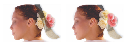 この例では、筆のイメージがレイヤーに含まれています。左の図では、筆のレイヤーは一番上に表示されています。右の図では、筆のレイヤーは一番下に表示されています。