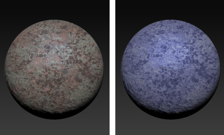 元のテクスチャの色を使用するテクスチャ ブラシの例 (左)。元のテクスチャの色と選択した色を混ぜ合わせます (右)。