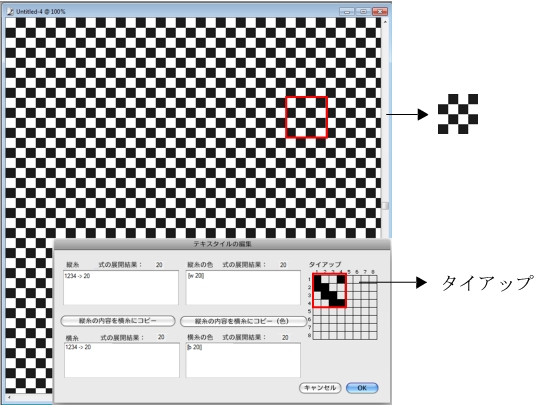 タイアップの目的は、指定された横糸を織るときに、どの列の縦糸を使用するかを示します。タイアップに、縦糸および横糸の式を組み合わせることにより、テキスタイル パターンが生成されます。