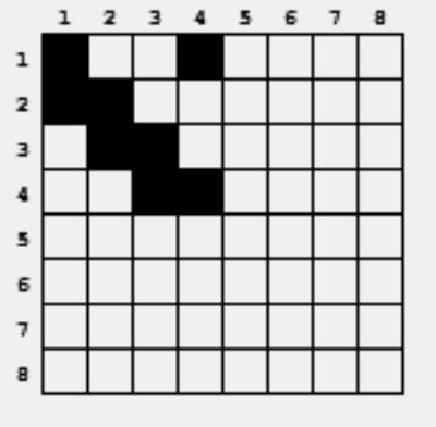 このタイアップでは、白のセルは、テキスタイル パターン内で横糸 (黒) が縦糸 (白) の上に配置されることを示します。4 番目の行と 4 番目の列に白いセルが配置されているため、テキスタイル パターン内で横糸 (黒) がより目立ちます。