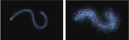 重力粒子ブラシでは、動きによって大きく伸縮するスイープ パスが作成されます。重力粒子ブラシでの粒子の動きは、惑星の動きに似ています。つまり、粒子のパスは、速度、加速度、およびその他の力によって大きく影響を受けます。ストロークの速さに応じて、粒子はブラシストローク内で密にとどまったり、力によって大きく引き離されたりします。