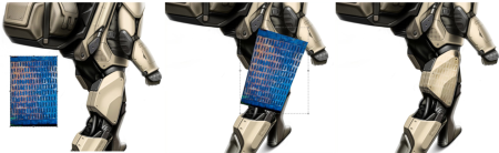左から右: オリジナルのテクスチャ、歪曲後のテクスチャ、テクスチャがモデルにブレンドされています。Erik Holmen 氏によるモデル。