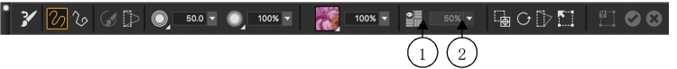 テクスチャの可視性は、プロパティ バーのコントロールを使って素早く調整できます。(1) [テクスチャの表示] ボタン、(2) [可視性] スライダ