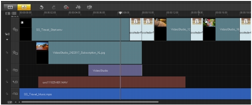 Um ein Video zu produzieren, müssen Sie zunächst Aufzeichnungen von einem Camcorder oder einer anderen Videoquelle importieren. Sie können dann die aufgenommenen Videos zuschneiden, anordnen, Übergänge zuweisen sowie Überlagerungen, animierte Titel, Begleitkommentare und Hintergrundmusik hinzufügen. Diese Elemente werden auf separaten Spuren in der Zeitachsenansicht und in chronologischer Reihenfolge als Miniaturen unter Storyboardansicht angeordnet.