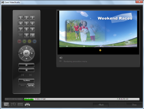 A questo punto, è opportuno vedere come appare il filmato prima di masterizzarlo su disco. È sufficiente spostare il mouse e fare clic su Riproduci per guardare il filmato e provare i menu sul computer. Utilizzare i controlli di navigazione come se si trattasse del telecomando di un lettore di dischi da salotto.